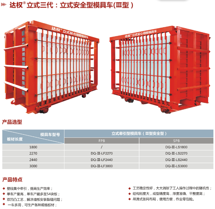 達(dá)權(quán)復(fù)合夾芯板立式模具車是達(dá)權(quán)首創(chuàng)的立式模具車,用于生產(chǎn)輕質(zhì)復(fù)合夾芯板,改變了傳統(tǒng)的臥式模具車生產(chǎn)形式,相對(duì)于傳統(tǒng)復(fù)合夾芯板臥式車,立式模具車更利于倒模拆模,大大提高了生產(chǎn)效率,降低了人工成本。性能已達(dá)到國(guó)際同類產(chǎn)品的領(lǐng)先水平。免費(fèi)提供本公司品牌、商標(biāo)、工藝流程的技術(shù)培訓(xùn),為建廠公司(合作廠家)全方位提供生產(chǎn)、安裝、銷售的扶持及服務(wù)。