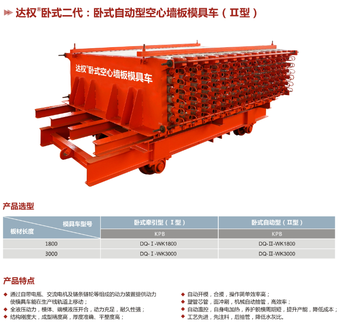 臥式空心板模具車可以生產(chǎn):空心條板(KPB)。模具車是輕質(zhì)條板生產(chǎn)線主要組成部分,生產(chǎn)線的產(chǎn)量主要由模具車數(shù)量的多少確定。在確定生產(chǎn)線之后最經(jīng)濟(jì)實惠的生產(chǎn)工具之一,能顯著的提高產(chǎn)能,是擴大生產(chǎn)的一大利器。免費提供本公司品牌、商標(biāo)、工藝流程的技術(shù)培訓(xùn),為建廠公司(合作廠家)全方位提供生產(chǎn)、安裝、銷售的扶持及服務(wù)。